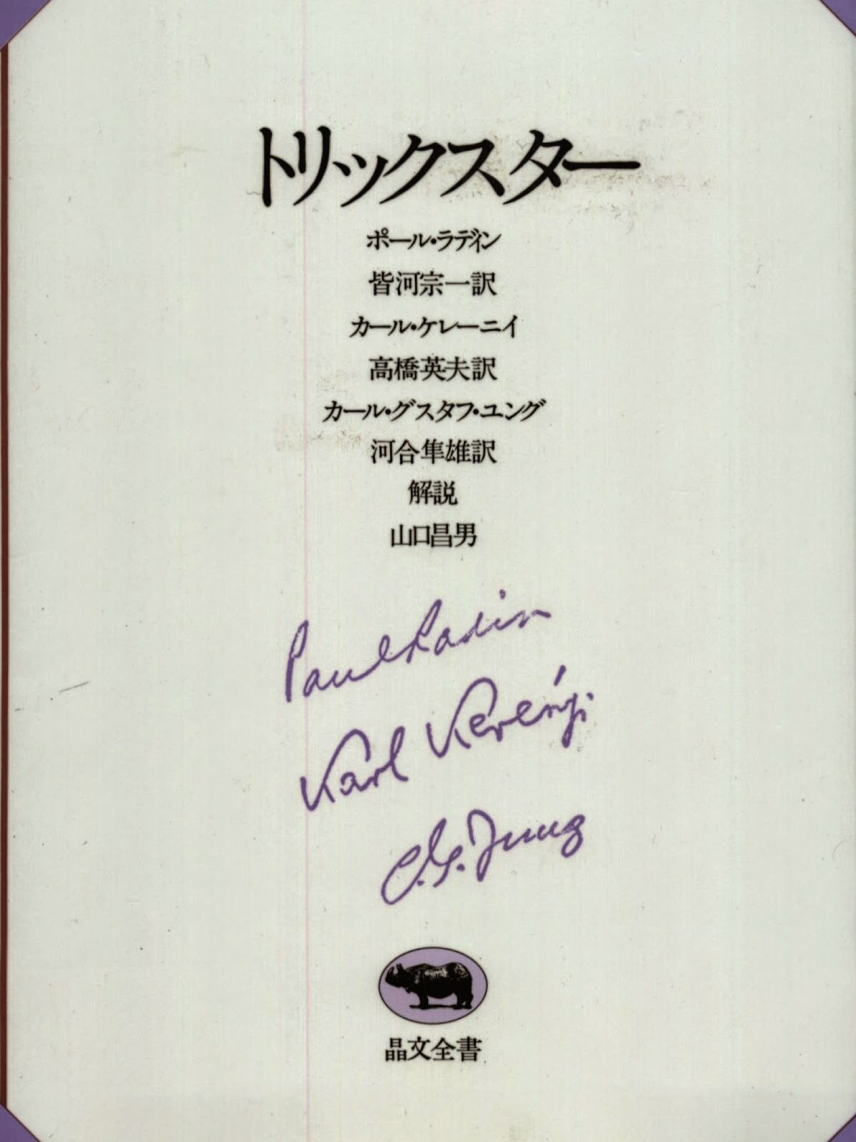 創造者であると同時に破壊者、善であるとともに悪であるという両義性をそなえて、トリックスターはまさに未分化状態にある人間の意識を象徴する。そして、既成の世界観のなかで両端に引きさかれた価値の仲介者としての役割をになう。